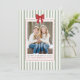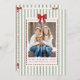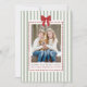 Fira högtiderna och era familjeminnet med detta julkort i salvia-grön-randigt tema med röd rosett och årssammanfattning. Med festliga salvia-gröna ränder, en livfull röd akvarellrosett och en infälld prickig ram för familjefotot kombinerar detta kort modern stil med lekfull julstämning. Baksidan har 12 runda fotofram som är perfekta för att visa familjens favoritögonblick från varje månad – redigerbara för att visa era personliga minnen eller oförändrade för en färdig design. Perfekt för familjer som vill ha en rolig, färgrik och personlig julhälsning, fungerar detta kort också vackert som ett julkort med årssammanfattning, ett familjehöjdpunktkort eller ett ”vilket år”-julfoto-minne