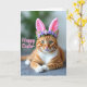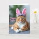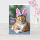Det här kortet visar en avspänd rödbrun tabbykatt med bärnstensfärgade ränder och vit bröst och tassar, liggande med sina främre ben varsamt korsade som om den poserade för en söt vårporträtt. Mjuka rosa kaninöron sitter på huvudet, och en liten krona av små lavendelblommor ger en öm och vänlig touch 🐰. Kattens gröna ögon ser rakt fram med en lugn och tillgiven fokus, som om den delar en tyst stund med någon nära. Ljus faller mjukt över pälsen och framhäver den släta texturen och de fina vita morrhåren som fläktar ut från nosen. Bakom katten tonar bakgrunden bort i oskarpa tvättar av lövgrönt och dämpat grått, och håller fokus på ansiktet och öronen. En kort påskhälsning visas över bilden i