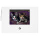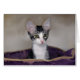 En grå och vit randig kattunge med stora öron sitter i en lila säng. På baksidan av kortet är han kramad med sin trefärgade syster.