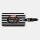 Elegant blom- monogrammed bagagemärkre för vintage för henne - svart tavlaramen för fauxen med rosa guld- glitterlook kantar, och den peachy rosa vintagerobuketten har det monogrammed namn som skrivs ut i elegant bokstäver. Modern svartvit randbakgrund. Baksida är den fasta svarten med information om personligkontakten för borttappadt bagage. Älskvärd pensiongåva för lärare.