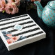 Trendig blomstermotiv, svarta vita ränder och blå prickar vintage-stil tekopps-tema servett design med en blå vintage guld folie prickig tekanna med vackra rosa akvarell blomster. Rosa blomsterarrangemang och djupt teal blad är placerade i hörnet av servetten för en feminin touch. Personliggjord med initialer i en blå vintage tekanna. Svarta akvarellränder och bleka blå prickar kontrasterar vackert med tekannans konstverk. Alla illustrationer som ingår i denna blomstervintage tekoppsservett är handritade originalkonst av Moodthology. Du kan anpassa textstorlek, textfärg, typsnitt och layout för din egen personliga designpreferens.