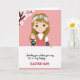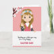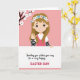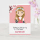 Denna design visar en stiliserad animerad ung kvinna centrerad mot en rosablommig bakgrund, leende med ett öppet och välkomnande uttryck som känns som en vänlig hälsning. Hon lyfter en hand i en mjuk våg, och hennes direkta blick ger en antydan till närhet, som om hon hälsar någon speciell. En mjuk blomsterkrans vilar i hennes långa bruna hår, blandar små vita, blekrosa och ljusblå blommor för en vårkänsla 🌷. Hon står bakom en bred vit banderoll som sträcker sig över den nedre halvan, vilket ger layouten en lugn och balanserad bas. Hennes topp är ljusröd över ett vitt lager, och hennes ärmar har svart-vita ränder som ger en modern touch utan att överrösta scenen. I det övre vänstra hörnet lutar sig en slank gren med små vita blommor inåt, och inramar