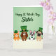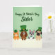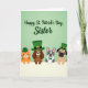 Designad med en mjuk ljusgrön gradient som fyller den övre delen, sätter detta St. Patrick's Day-kort en söt och vänlig ton med en mjuk högtidshelsning centrerad nära toppen i flytande grön bokstavsstil 💚. Under texten lutar sig fyra mysiga djurkompisar över en bred vit horisontell kant, med ansiktena tätt ihop som om de delar ett tyst skämt. Till vänster bär en randig orange katt en liten grön bowlermössa, lutad något mot gruppen i en följesam ställning. Nästa är en brun långörad hund i en hög grön cylinderhatt med en guldbeslag, lutad framåt som om den är ivrig att delta i samtalet. En grå-vit hund med alerta öron och en grön fluga står i mitten och ser lugnt framåt som om den håller alla tillsammans. Till höger bär en hjorthyad hund med tillplattad nos och stora ögon en liten grön cylinderhatt, med blicken riktad mot de andra med en tillgiven