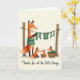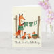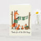 Det här kortet visar en mysig scen med en vuxen rävliknande figur som står bredvid två rustika trästolpar och varsamt hänger små gröna kläder på en torklina, som om den vårdade ett hem med lugn omsorg ❤️. Vid dess fötter står två mindre rävliknande ungar vända mot varandra med mjuka leenden och håller en randig strumpa mellan sig som en delad hemlighet mellan vänner. En tredje liten ligger i en flätad korg och tittar på med en avspänd och belåten min som bidrar till närheten i ögonblicket. Bakgrunden är varm och krämfärgad med ett mjukt ljus som gör den rödbruna pälsen, de djupt mörka accenterna och de skogsgröna kläderna lugna och inbjudande. Fina detaljer syns i träets ådring på stolparna, den flätade korgens struktur och de mjuka vecken i de miniatyrmöbler, vilket ger bilden en känsla av att vara berörbar. Längst ner sitter fr