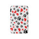 Drawings of dog paw prints and red hearts in many sizes.