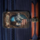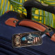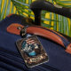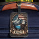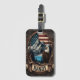 En örn-perches på gren, med ett bergslandskap och en amerikansk flagga. Namn Randy visas på en träbanderoll.