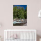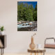 Den häftande vattenfärgen torr borste-korsningseffekten på bilden av flodrapider med sten, träd och ett mörk blått himlar.