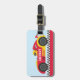Ett bagagemärke med en illustration av en förare i en gult och en röd tävling-bil med kontrollerad svart och vit inslag från tävling. Perfekt för barn och pojkar som kärlek tävla fordon och snabbhet!
