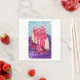 A slice of cake topped with vibrant red raspberries drips with rich sauce onto a dark purple plate. The background features a blue lattice pattern, complementing the dessert's vivid colors.