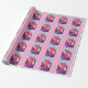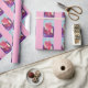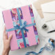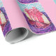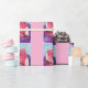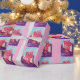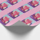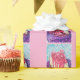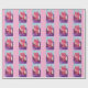 A slice of cake topped with vibrant red raspberries drips with rich sauce onto a dark purple plate. The background features a blue lattice pattern, complementing the dessert's vivid colors.
