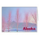 Digitalmålning av fågeltäckt träd i snö; rosan i snö tonades av sol. Texten "Alaska" visas också. Här i norr är det vanligt att se snö täckt träd som slocknar antingen rosa eller orange vid sol hängande vid horisonten.