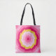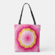 Den här bilden är en sjudande, geometrisk spiral-design med koncentriskt taggigt ringar i skuggor av rosa, magenta och gult som strålas från mitten i ett kalejdoskop-liknande mönster. De upprepade formerna och det energiska färg står i kontrast till ge som en lekfull, reflekterande och visuellt dynamisk känsla som framkallar både solljus och bubbelgum söthet