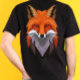 din stora geometriska fox t-shirt-design med djup svärta och grått-toner, enkel bakgrund och svart ögon för ett kraftfullt och enkelt utseende.