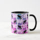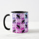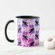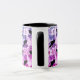 Vackra korken över hela mönster-kaffet mugg, rosa lila blå toner med svart korv, måne och blommigt.