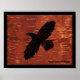 En enkel, svart silhuett av en Raven (Corvus corax) på en bakgrundsbild av den rödaktiga baksidan (inuti) av fågelbark. Korvbilden har en lätt "grov" eller "försliten" effekt. Lägg till din egen text.