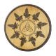 Nio levande ravens (Corvus corax) cirkel runt ett knutet Norse/Celtic ring. En triquetra, en triangulär figur med tre sammanflätade bågar, visas i mitten. Allt läggs ovanpå en gammal papper bakgrundsbild, ge det medeltida. Du kan byta färg i gräns ring eller ta bort det helt. I Norse mytologi är siffran nio kopplad till Odin och hans valkyries, som anknyter till livets cykliska karaktär, död och förlossning. Ravens var mångfasetterade symboler, inklusive kopplingen mellan de levande och de döda. I själva verket kan man tänka sig en bild av ett aviärt ytterområde.