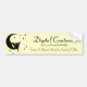 En silhuett av en älv sitta på måne, omgiven av stjärnor. Butikens webbplats adress och rubriken skrivs ut i svart. Stötdetikettbakgrunden färg är en mjuk gult.