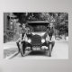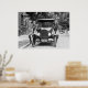 Old photo of young women, in uniform sitting on front fenders of antique car, 1920s.