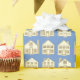 Realtor-presenter som omsluter papper och party-dekoration med konstnärliga rader av illustrerade hus.