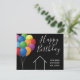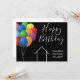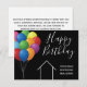 Det här moderna Grattis på födelsedagen-kortet är anpassningsbar med ditt realbolag namn under chicens kursiva typografi. Dessa vackra svarta och vita kort har en enkel linje teckning i ett hus bredvid färgstarka ballonger. Verkliga gods-elak i marknadsföring som når ut till tidigare kunder.