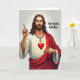 This card features a waist-up portrait of a man with flowing brown hair, a neat beard, and bright blue eyes set against a pale, open background. He wears a white tunic under a deep red draped cloak, with folds that feel carefully drawn and a steady, inviting gaze that leans more friendly than stern. His right hand is raised with one finger pointing upward, while his left rests close to a glowing red heart emblem on his chest that gives off soft golden rays, like a quiet promise shared between close companions 🌷. Around his neck hangs a thick gold-toned chain with a cross pendant, adding a modern edge to the classic look. To the right of his head, large gothic-style lettering appears in dark ink, placed high and tight beside his face for maximum contrast. The phrase is written in an irreverent, casual tone, turning the solemn pose into something teasing and rebellious, like an inside joke between friends 🐇. The heart emblem is bright red with a warm golden halo, and the red cloak stands out strongly against the light, minimal backdrop.