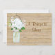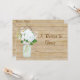 Detta 5" x 7" kort är utformat för att gästerna ska dela sina favorit recept med bruden och brudgummen. Du kan skicka det med inbjudan och be dem fylla i det och returnera det till bröllopsfesten. En bra idé är att ha en lottning bland de som delat ett recept för att uppmuntra deltagande. Denna Rustik Bondgård Blommig Stil Bröllopsinbjudan Set skapades från handmålad akvarellkonst skapad av Audrey Jeanne Roberts. Glasburken målades varsamt i en mjuk akva blågrön och fylldes med en bukett av blå hortensior och vita vallmor i en vacker mjuk pastellblå som plockades för hand i Audrey Jeannes egna trädgårdar och handmålades. Vintage-inspirerade syltburkar är en mycket trendig designstil för boho-chic bröllop. Bakgrunden är ett grått väderbitet staket av tallbrädor som är åldrat och slitit för att förmedla den utomhusliga, ladulik
