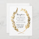 OBS: DET FINNS INGET VERKLIGT GULDLODDFÖNSTER ELLER GULD METALLISK BLÄCK SOM ANVÄNDS I DENNA DESIGN. Den är skapad med ett högkvalitativt fotografi av verkligt guldblad som överlagras på en handmålad bild. DENNA STORLEK PASSAR INTE FÖR KVADRATISKA ELLER RUNDA INBJUDNINGAR - byt till 3 1/2" x 5" för att använda dem. Matchande mottagningsinbjudningar för formella evenemang på en separat plats, för separata gästlistor eller andra användningsområden. Tidlös. Enkel. Modern. Vacker för ett bröllop i en frodig utomhus trädgård på våren eller sommaren med lövverk och grönska som bakgrund och mottagningstema. Handritad och målad i ak