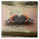 Den här plattan i fantastisk är ett foto av en vacker rödamiral Butterfly (Vanessa atalanta). Denna art är främst svart med vita prickar och vackra röda band på vingar. Fotot visar fjärilen, med vingarna öppen, som vilar på en tegelvägg som tittar på kameran. Fotografiet togs med makrofotografi för ett detaljerat resultat.