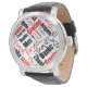 En roligt färglös klocka ansikte designad med röd och svart Tack skriven på flera språk och en rad olika typsnitt stilar över vitt med vintagen läderband. Klicka på Anpassa! om du vill välja en annan bakgrund än färg under Redigera och Bakgrund. Plocka från en mängd av "Stilar" och "Färg" under Alternativ.