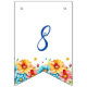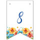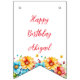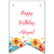 Banderoll för personlig i rött och blått med söt vattenfärgsillustration av en födelsedagskalas med blommor, ålder och namn.