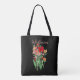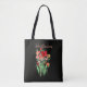 Colorful red and pink wildflowers and green stems watercolor on black tote bag.