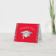 This modern design features a graduation hat and confetti in silver on a background of red with white text.