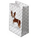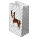 Desteis ursprungliga tecknad illustrerar en söt röd och vit jackar färg Boston Terrier-hund. Bakgrunden har mönster i grått hund tass avtryck.