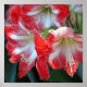 Tre stora, röda och vita rand Amaryllis blommar. Håll i en blommigt med Columbine och Clematis.