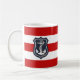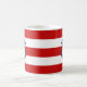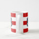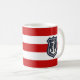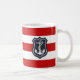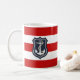 Ett dynamiskt nautiskt kaffe mugg med vitt rött och vitt rand och en marin blå sköld med fraktens ankare. Det är ett underbart val för strandhem, båtar, sjömän eller alla som har ett havsbottentema.
