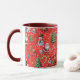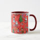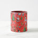 Christmas-themed pattern featuring Santa Claus, reindeer, snowmen, elves, Christmas trees, candy canes, and snowflakes on a red background
