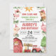 Red Barn Tractor Boskap Birthday Invation Cute farm themed girl's födelsedagsinbjudan med fyra söta boskap, en röd lada och traktor, en skylt, chick och sol. Baksidan av inbjudan är en rödhårig mönster. Flickans inbjudan till gårdstid är perfekt för en flickas födelsedagsfest på gårdsplanen.