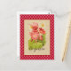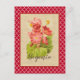 Vintagens botaniska illustration visar buketten av begonia på lagrar med utseendet av en kronburlap. Modern text i skripttitel täcker över och en bakgrund med rött och vitt quatrefoil mönster