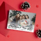 Vågräts julkort med God jul och gott nytt år i en charmerande stil omgiven av grönska och röda bär med en del av din familj.