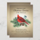 Julmiddagsinbjudan med en vacker röd kardinal sitta i grenar i gräs träd.