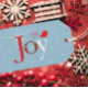 En julklapp med en originalillustration av en vit fågel sitta på texten Joy mot en blå märkre med snöflingor.