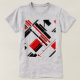 Ett modernt konsutseende skapas i denna geometriska utformning med påverkan från det moderna stil som finns i medelårhundradet. En abstrakt mönster av former och linjer, lutad på diagonalen, visas i ljusröd och svart. Bild här på en grått t-shirt av "lätt stål", som även finns i ett antal stilar och färg, är en "bärkraftig konst" som ser levande, djärv och konstnärlig ut, ett klassmässigt tillägg för avslappnad, vardaglig bära (för verksamhet från arbete/skola till idrott till avslappnande/socialisering/löpande ärenden runt staden). Särskilt för dem som arbetar på distans och/eller tillbringar mycket tid hemma bidrar skjortan till känslan av att vara "klädd" och "klädd" tillsammans med en personlig stil.