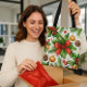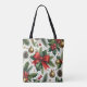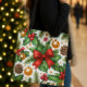 Den här julklappen visar en festlig helgdag med röda bögar, guld prydnadsföremål, garland och löv på vit bakgrund. Det är idealiskt för att transportera livsmedel eller för den dagliga användan under julhelgen.