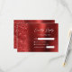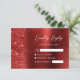 This elegant modern wedding RSVP card features a faux diamond glitter border on a red faux brushed metal background. The text is in modern handwriting script and sans serif font, with spaces for guests' names and responses. The reverse side features a matching red brushed metal and glitter design.