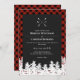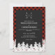 Rustic bröllopsinbjudan med en röd buffelcheck mönster, ditt initialer i ett korsat pilmonogram. Vid grund i den rustiska bröllopsinbjudan täckte snö grisen.