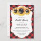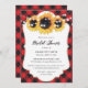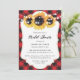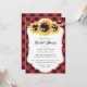 En söt röd buffel plaid blommigt inbjudningskort för möhippan med solblommor och strand ljus på en röd, kontrollerad bakgrund. Matchande objekt är tillgängliga.