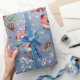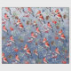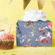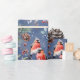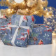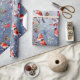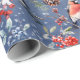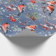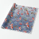 En helgdag med papper färg som målats av Eurasiska bullfinkfåglar och som är märkt med röda och blå bär med gräs-koner och grenar i ett upprepat mönster på blå botten.
