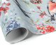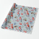 En helgdag med papper färg som målats av Eurasiska bullfinkfåglar och som är märkt med röda och blå bär med gräs-koner och grenar i ett upprepat mönster på blå botten.