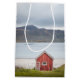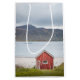 Resefoto av en traditionell norsk rött stuga på stranden i Ramberg, Lofoten Islands. Photo © Sebastian Mask