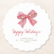 Simple Red Candy Stripe Bow Holiday Party Paper Coasters with editable headline in red handwriting font.